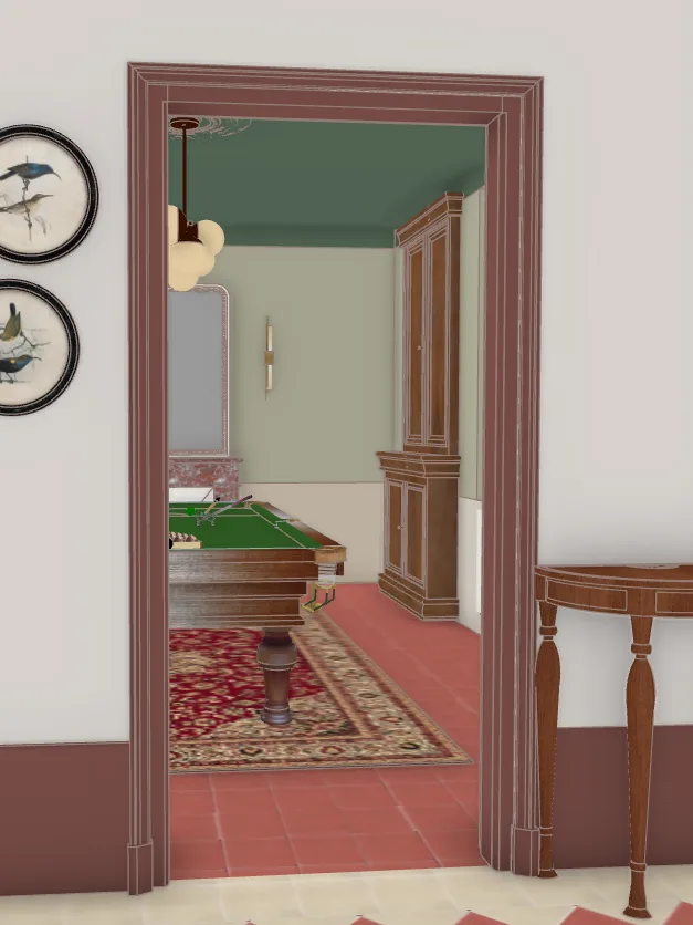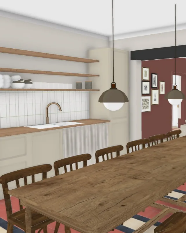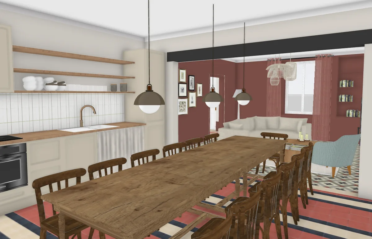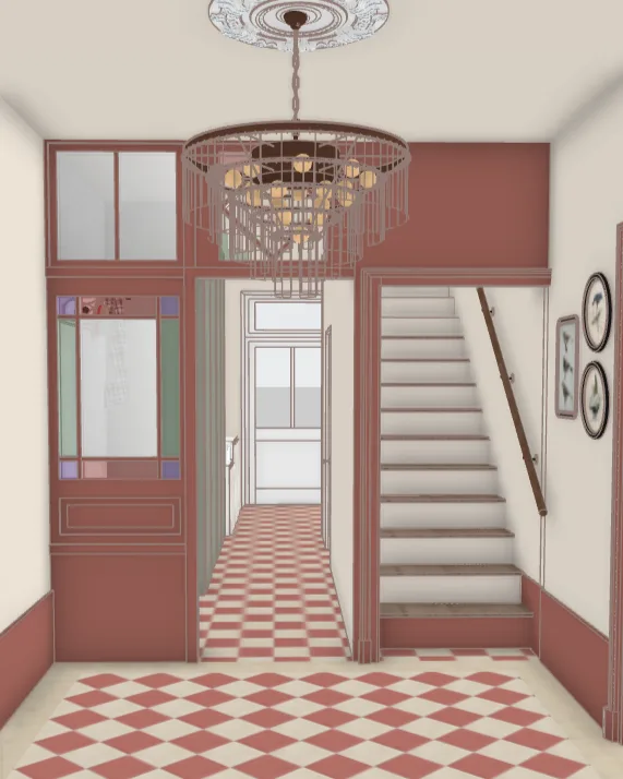 Le projet vise à redonner à la maison son standing d’origine en réinterprétant les codes des demeures bourgeoises, tout en intégrant confort contemporain et convivialité. Les carreaux de ciment existants sont conservés et l’entrée est repensée autour d’un rouge bordeaux affirmé, apportant caractère et chaleur dès l’arrivée.